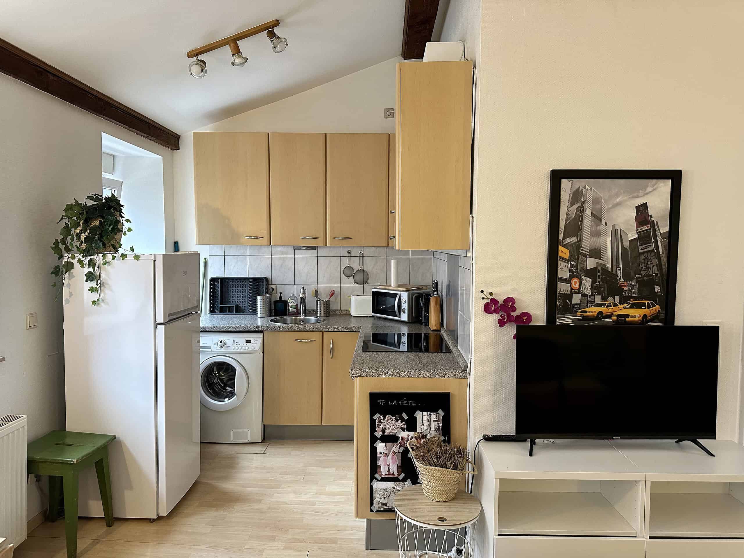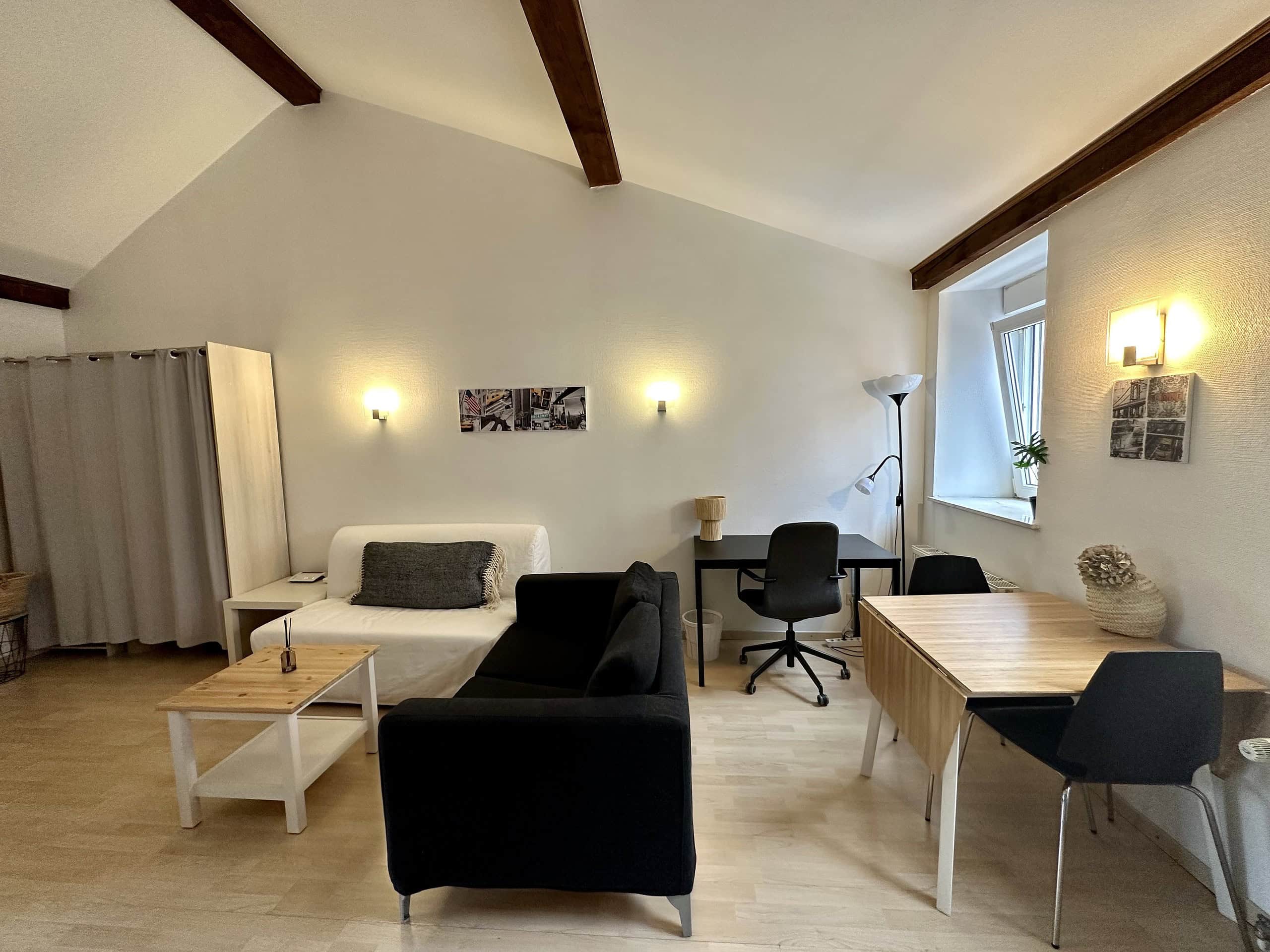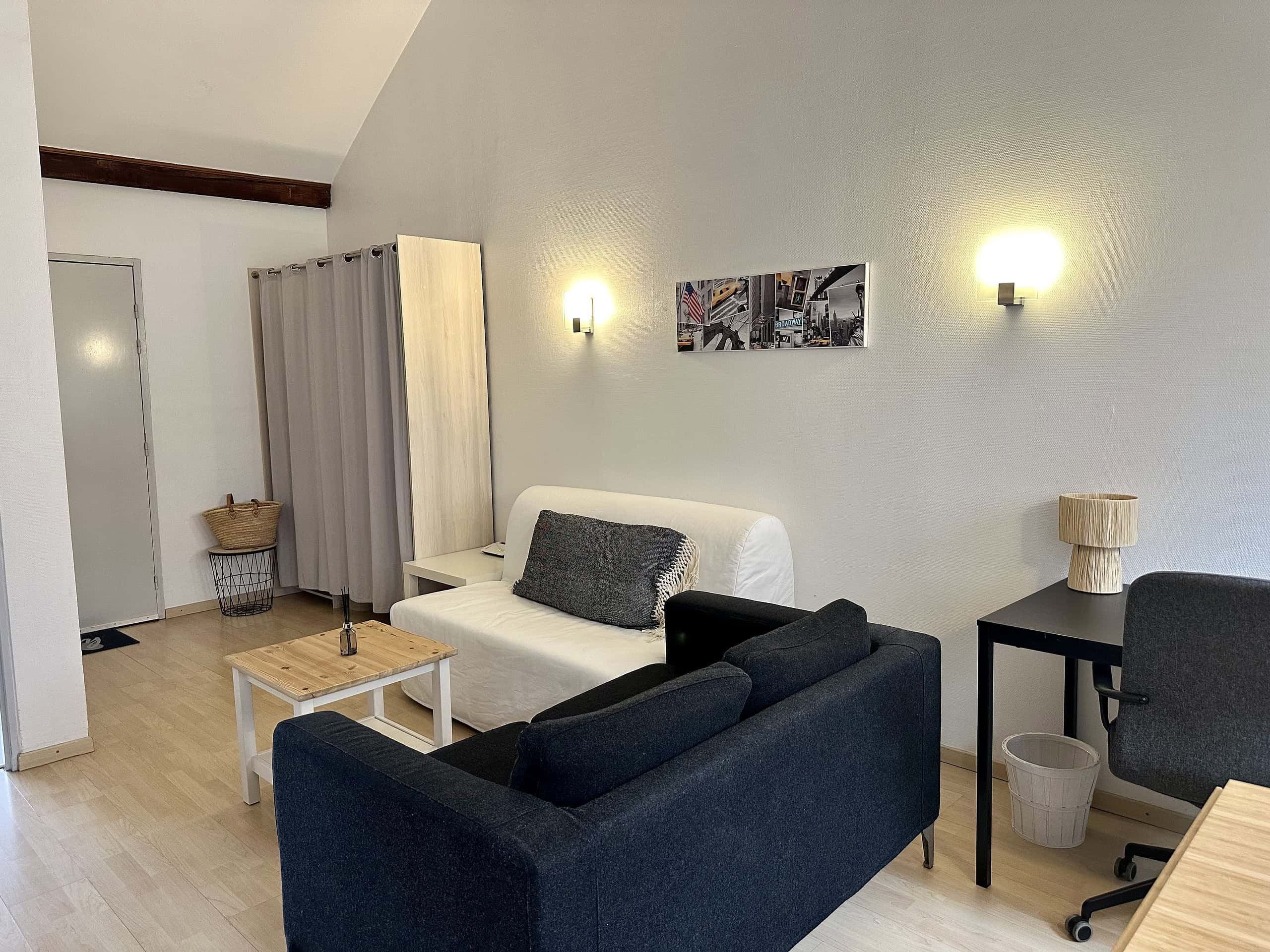 Situé à 50 mètres de la place de Paris et de l’avenue de la liberté, cet appartement meublé de 40 m2 dispose d’une jolie hauteur sous plafond avec poutres apparentes. Il est situé au 3ème et dernier étage sans ascenseur d’une petite résidence bien entretenue.