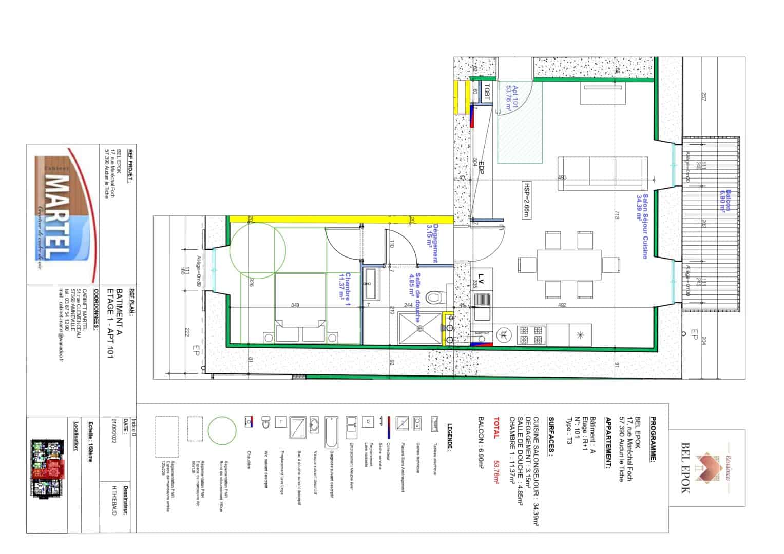 Votre logement : l’appartement A101 est un F2 se situant au 1er étage et d’une superficie de 53,76 m2. Le bien dispose d’une pièce à vivre de 26,25 m2 ainsi que d’un balcon de 6,9 m2.