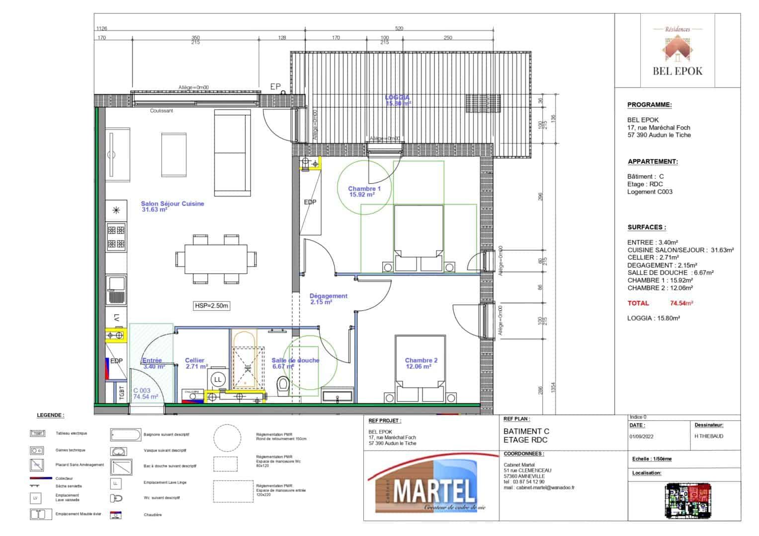 Votre logement : l’appartement C003 est un F3 se situant au rez-de-chaussée et d’une superficie de 74,54 m2. Le bien dispose d’une pièce à vivre de 31,63 m2 ainsi que d’un balcon de 15,8m2.