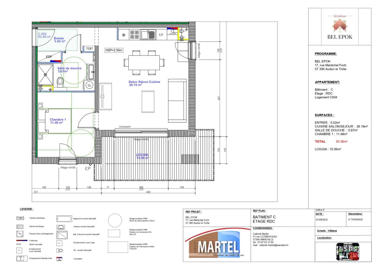 Votre logement : l’appartement C004 est un F2 se situant au rez-de-chaussée et d’une superficie de 50,36 m2. Le bien dispose d’une pièce à vivre de 28,19 m2 ainsi que d’un balcon de 15,09m2.