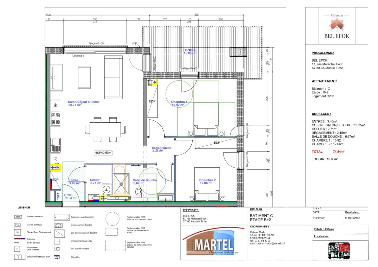 Votre logement : l’appartement C203 est un F3 se situant au 2ème étage et d’une superficie de 74,54 m2. Le bien dispose d’une pièce à vivre de 31,63 m2 ainsi que d’un balcon de 15,8 m2.