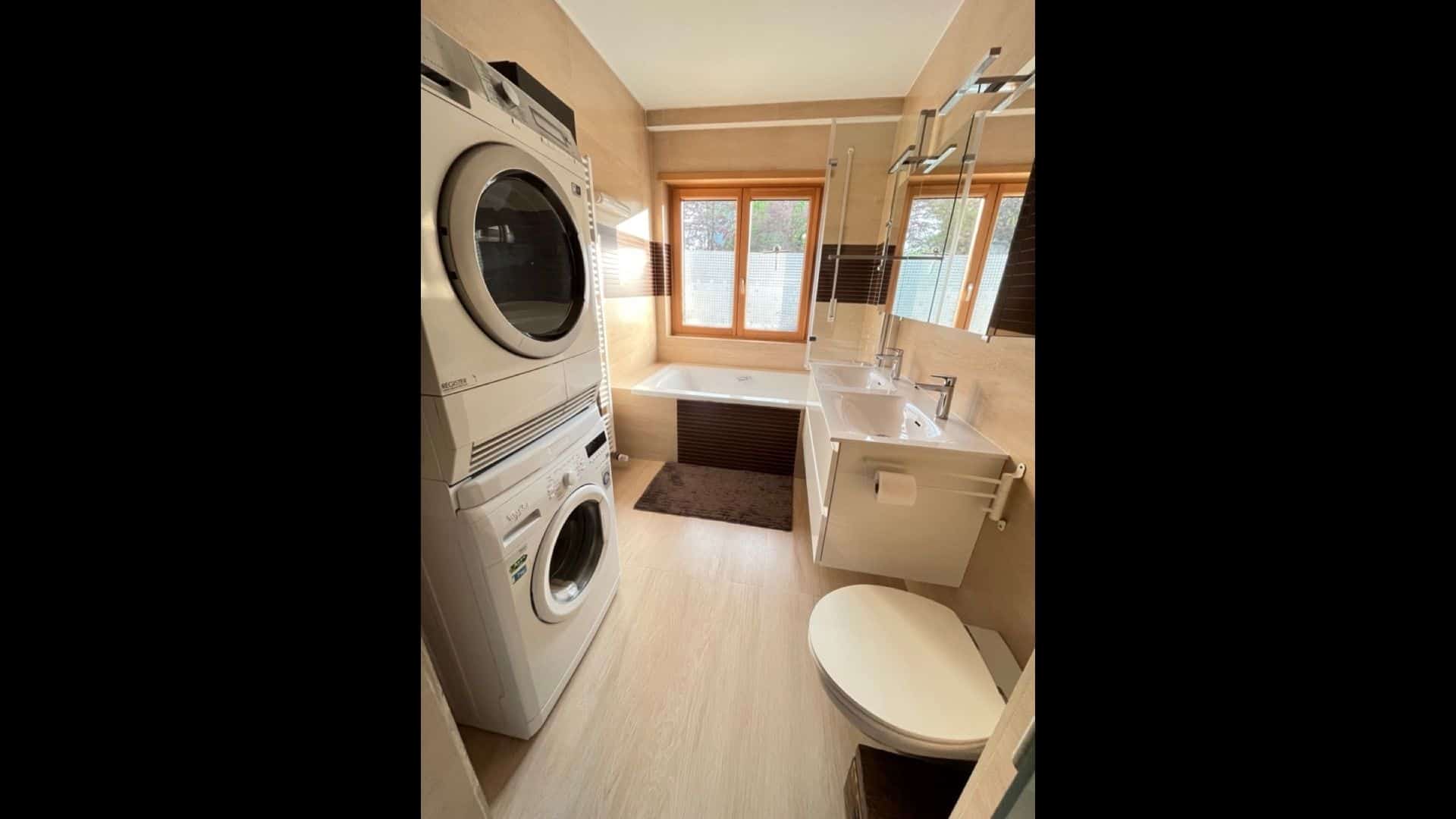 - Une salle de bain de 6,3 m2 avec grande baignoire, WC, grande vasque et machine à laver, sèche-linge (possibilité d’une buanderie au sous-sol).