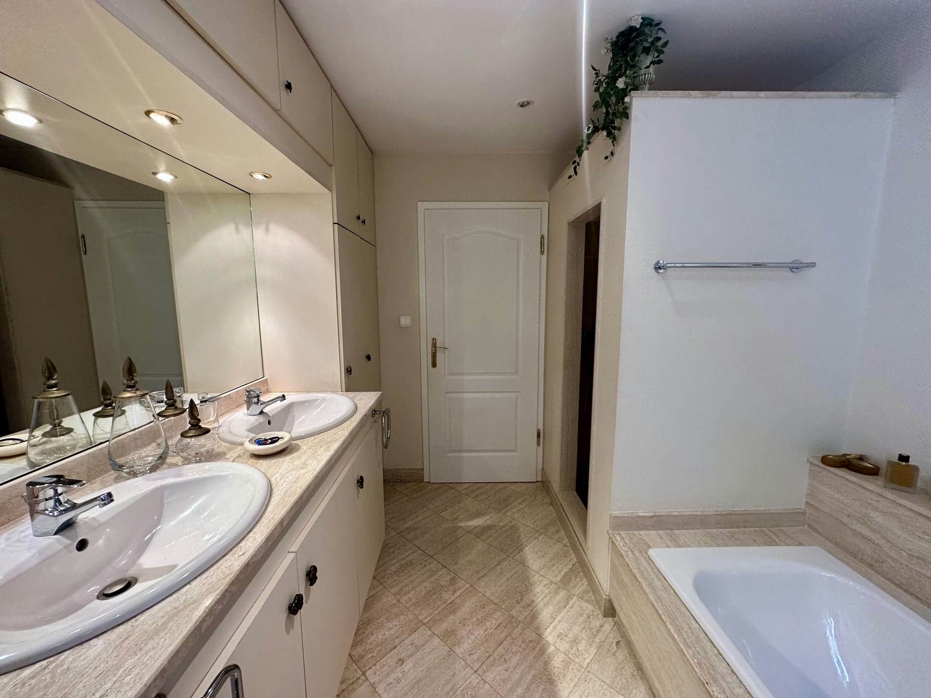 RDC: derrière un élégant porche, le rez-de-chaussée offre un généreux espace d’entrée grâce à une hauteur sous plafond d’environ six mètres. Le coeur de la maison se découvre à cet étage. La pièce de vie mêlant salon et salle à manger invite à la convivialité avec sa cheminée et ses ouvertures sur les 2 balcons. La lumière traversante y est superbe, à travers une majestueuse baie vitrée. A côté tourné vers le sud, la cuisine s’ouvre également sur le balcon. Plus loin s’invite au calme, deux chambres, une salle de bain en travertin avec douche et baignoire et des toilettes séparées avec lavabo.